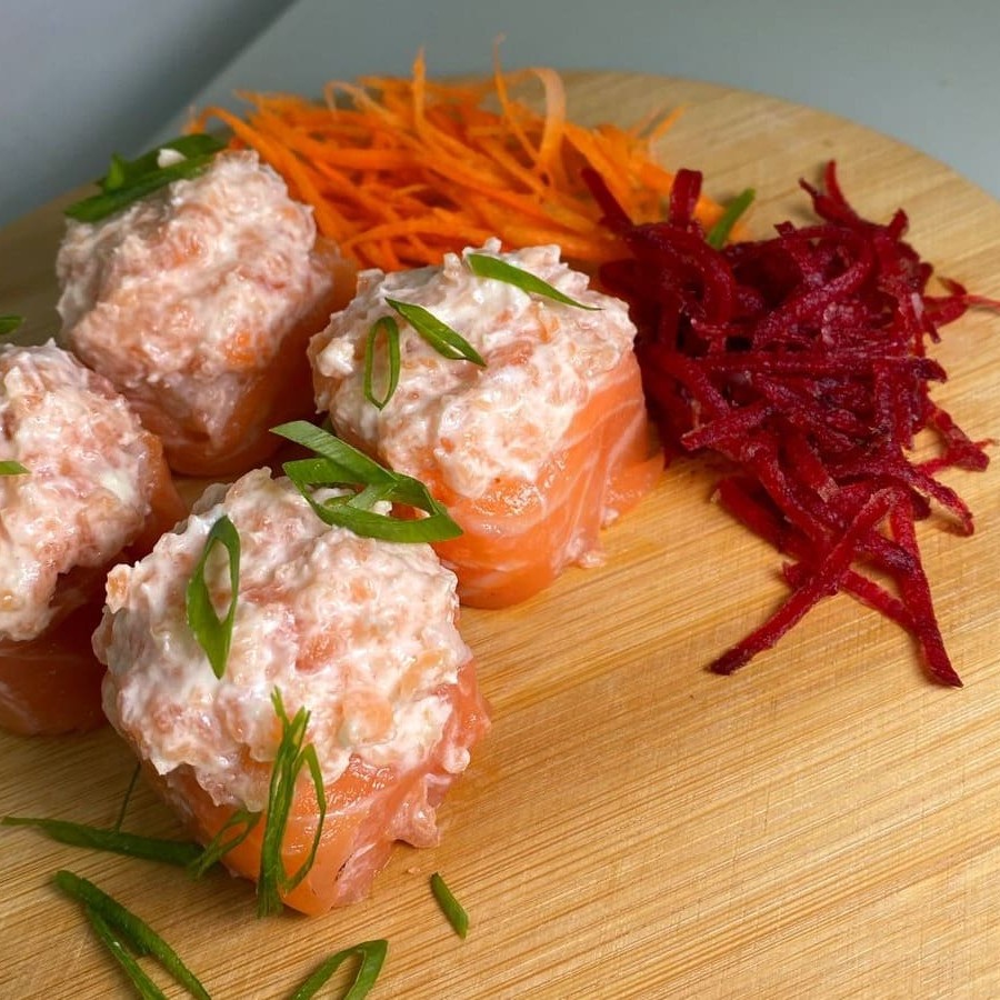 Bola de arroz enrolado com uma lâmina de salmão, cream cheese e recheado por cima de pasta de salmão e cebolinha.