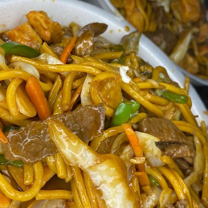 Macarrão,carne, frango, camarão (legumes , repolho,cebola,cebolinha, cenoura, pimentão