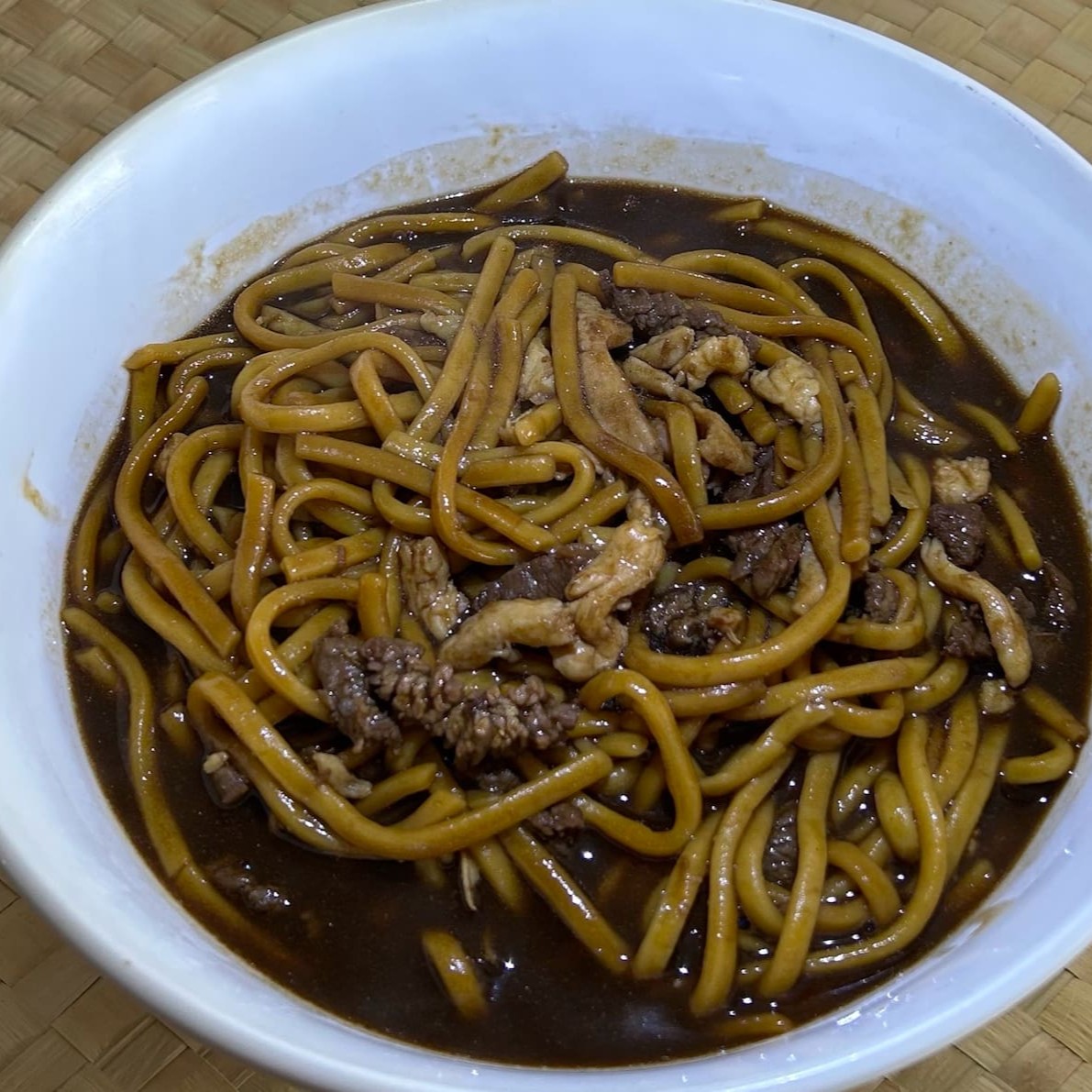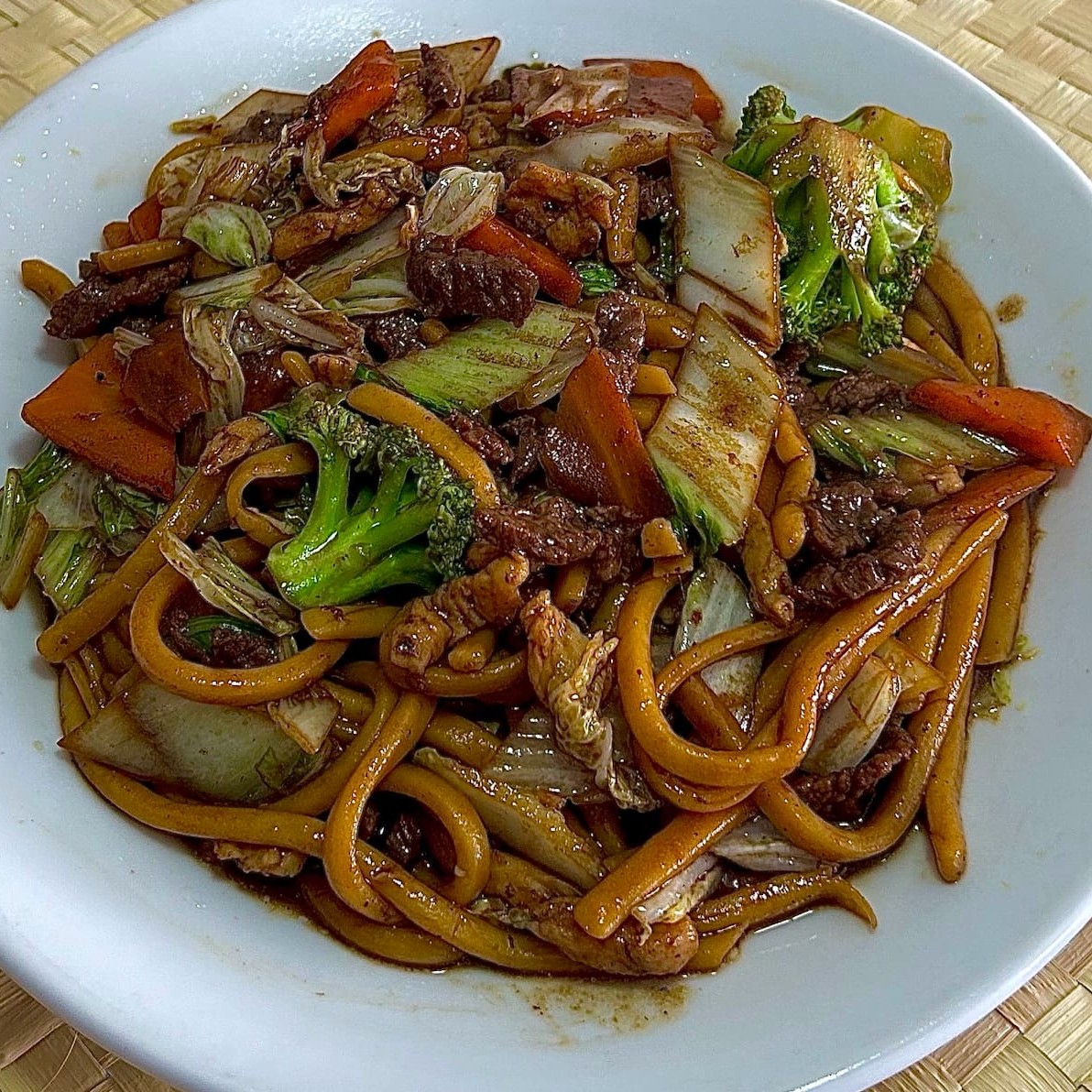 Yakisoba de Carne e Frango Macarrão com legumes frescos (acelga , cenoura) ao molho artesanal da casa.