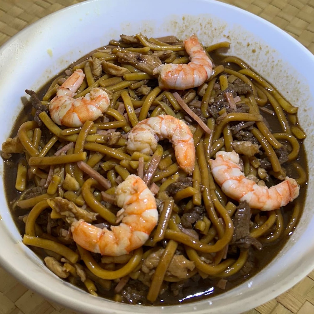 Delicioso macarrão oriental, cm proteínas de carne e frango e Finalizado com molho shoyu (adição de camarões Refogados)