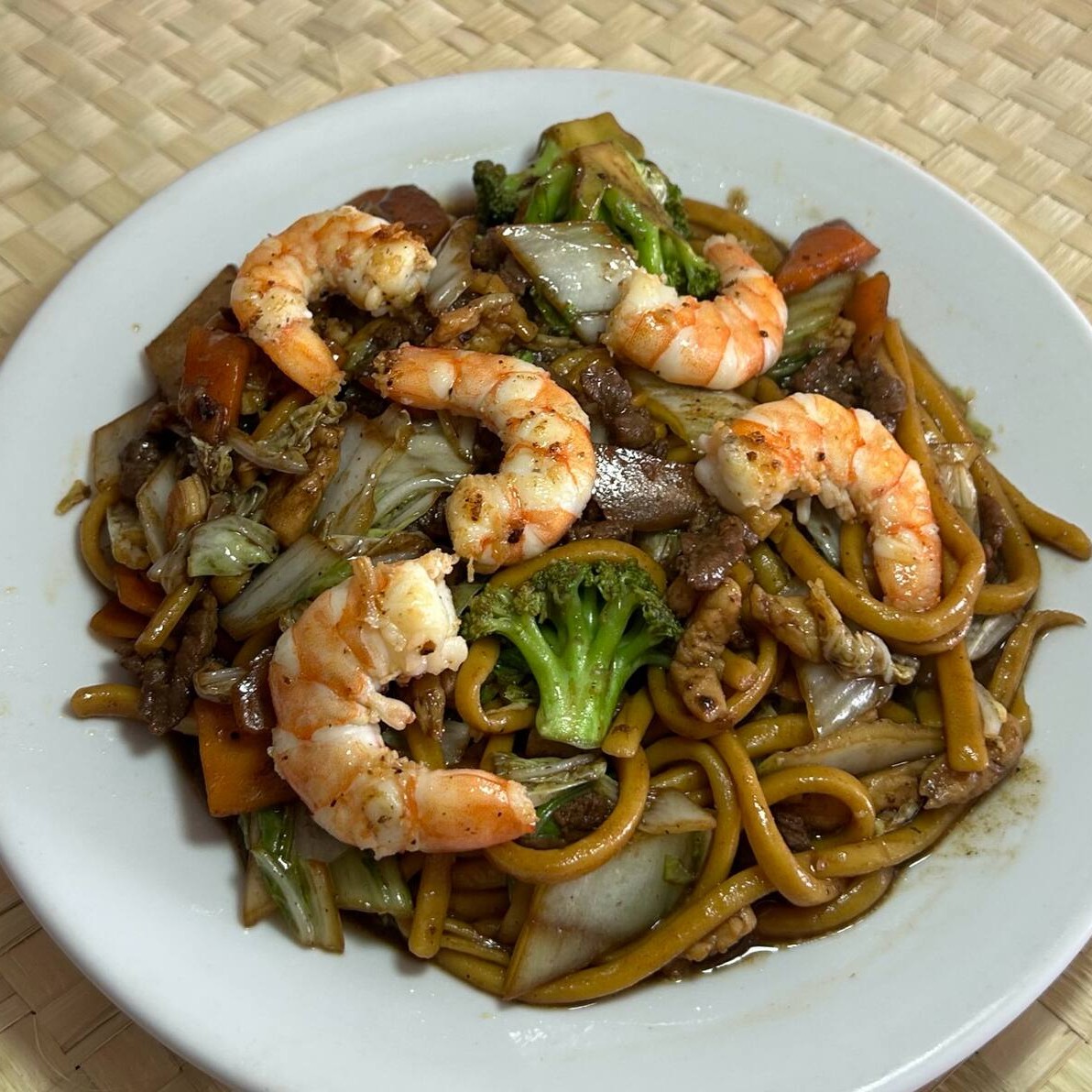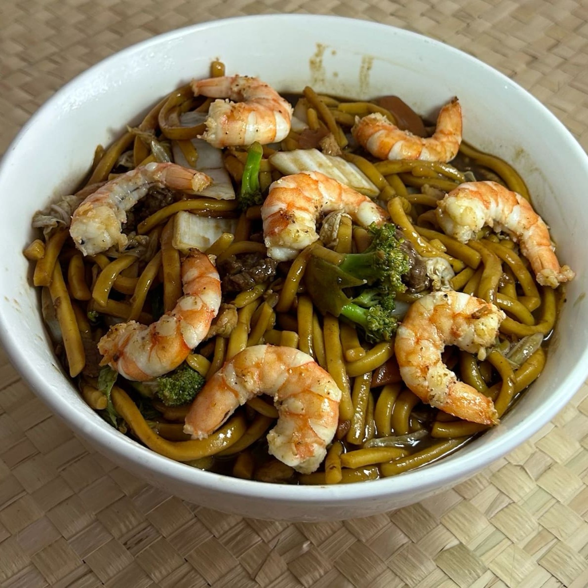 Delicioso macarrão oriental, cm proteínas de carne e frango com a adição de camarões Refogados, Acompanha tbm legumes frescos (cenoura, brócolis, acelga) e Finalizado com molho shoyu