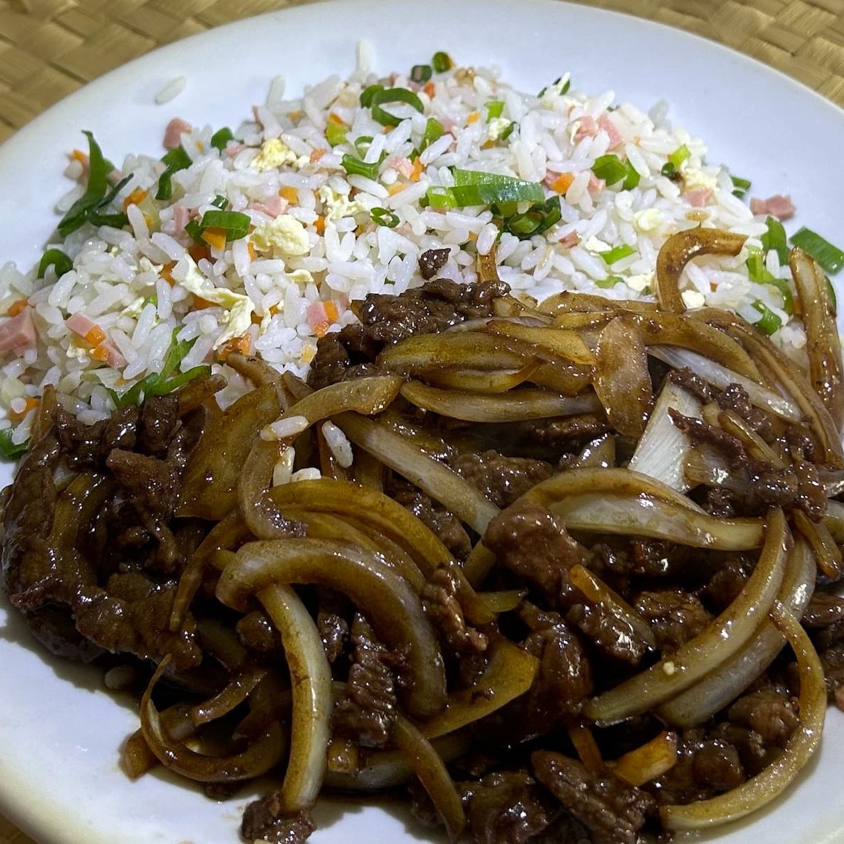 Tiras de carne macias e aceboladas, servidas no ponto acompanhada com arroz shop suey