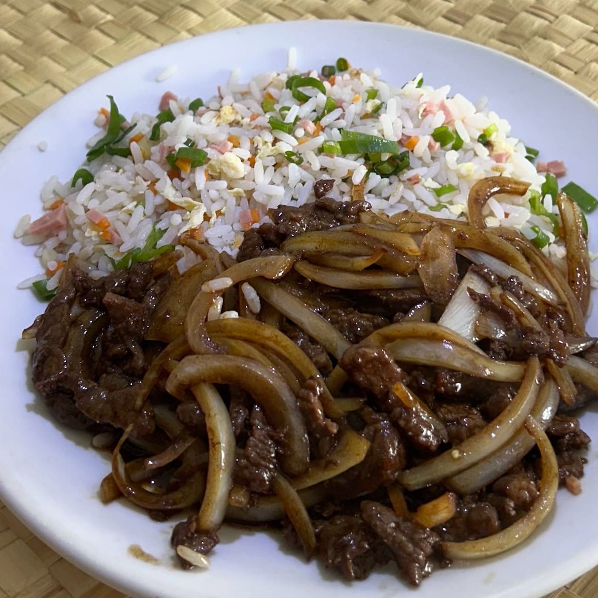 Tiras de carne macias e aceboladas, acompanhada cm arroz shop suey