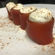 Finas fatias de doce de goiabada enroladas com cream cheese. Finalizado com canela.