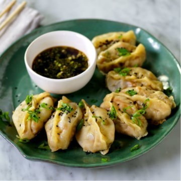 Tradicional pastel japonês cozido no vapor e selado no óleo de gergelim, acompanhado de molho ponzu.
