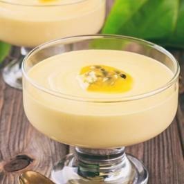 Delicioso mousse de Maracujá finalizado com calda de maracujá.