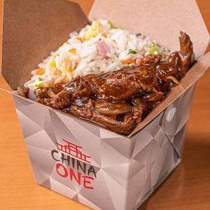 Porção generosa de Carne e fatias caprichadas de cebola com o molho especial a base de shoyu acompanhado com delicioso arroz chinês