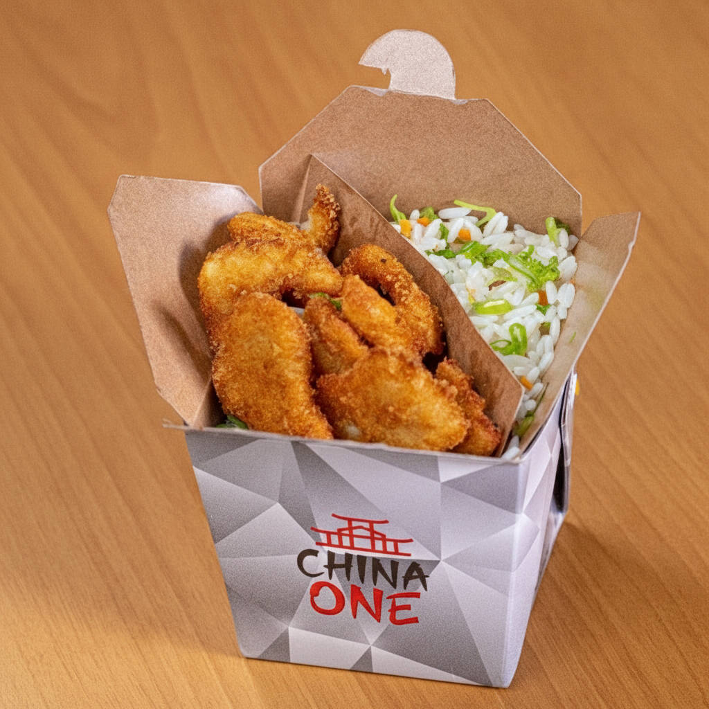 Deliciosos filé de frango empanados e temperados, fritos, em massa com farinha panko acompanhado com delicioso arroz chines.