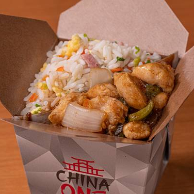 Deliciosos cubos de filé de frango com cebola e pimentão servidos com molho especial a base de shoyu acompanhado com delicioso arroz chines.