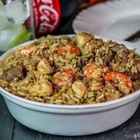 Arroz, frango, carne, camarão, ovo, cebola e cebolinha.