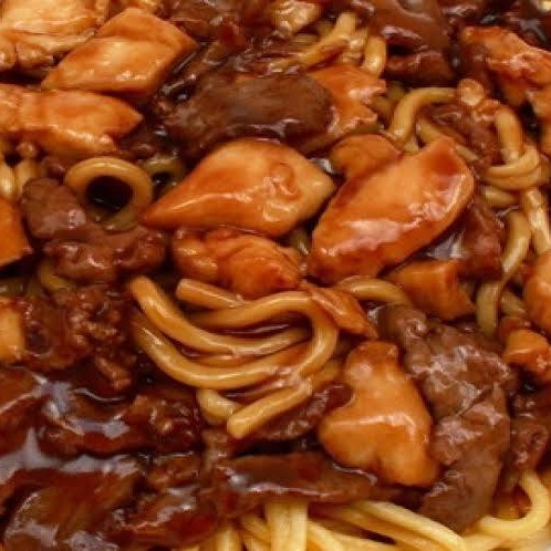 Acompanha: carne com batata frita envolvidos no molho shoyu, arroz shop suey.