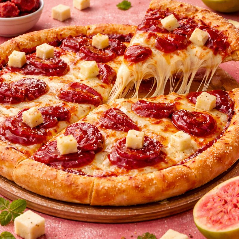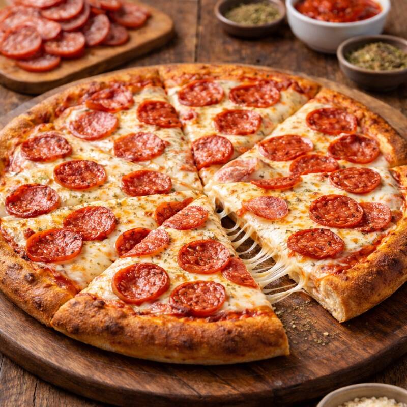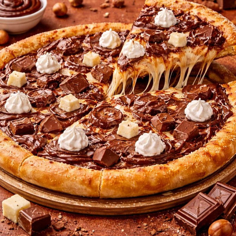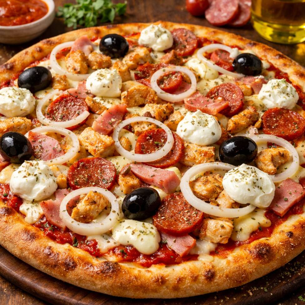 Molho de tomate, queijo mussarela, frango, presunto, calabresa, cebola, azeitona, cream cheese e orégano.