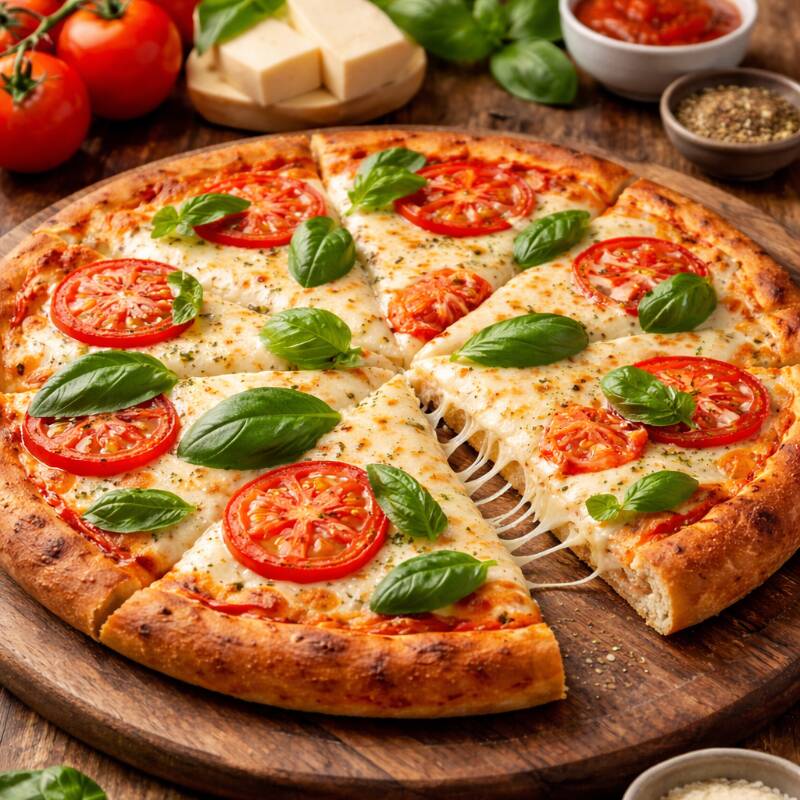 Molho de tomate, queijo mussarela, tomate, manjericão e orégano.