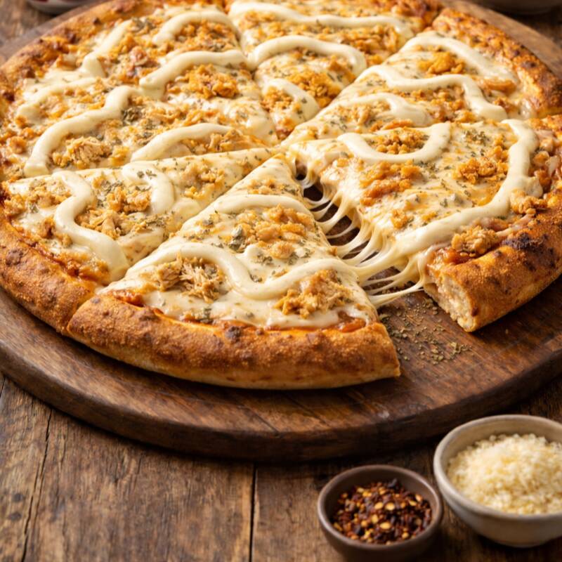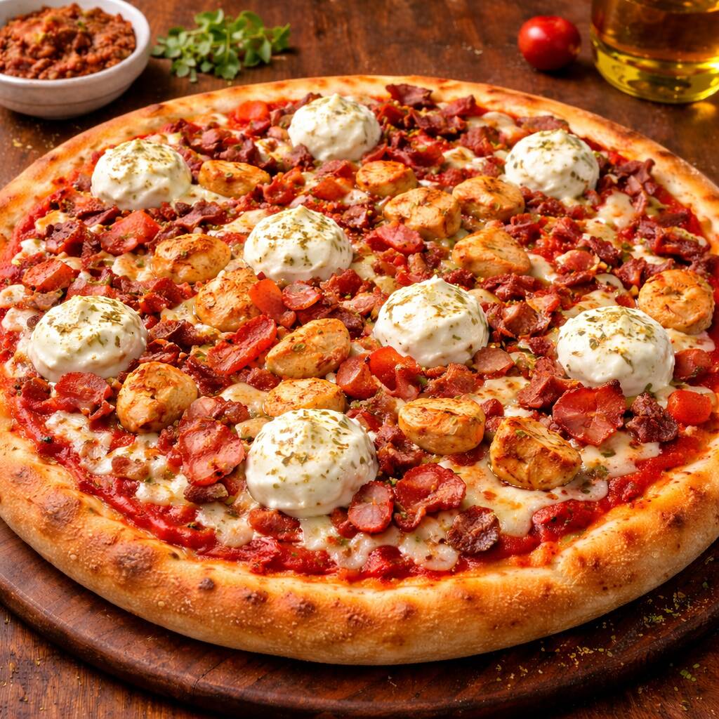 Molho tomate, queijo mussarela, frango, bacon, cream cheese e orégano.
