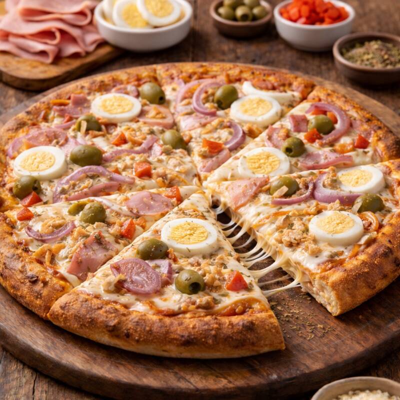 Molho de tomate, queijo mussarela, presunto, cebola, pimentão, ovos, azeitona e orégano.
