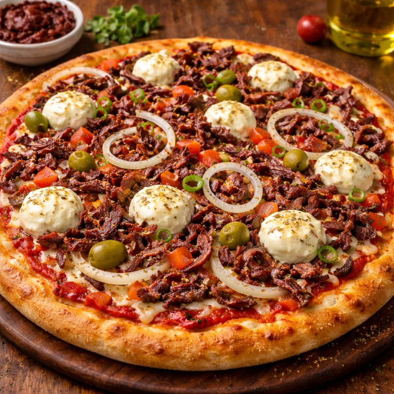 Molho de tomate, queijo mussarela, charque, cebola, azeitona e orégano.