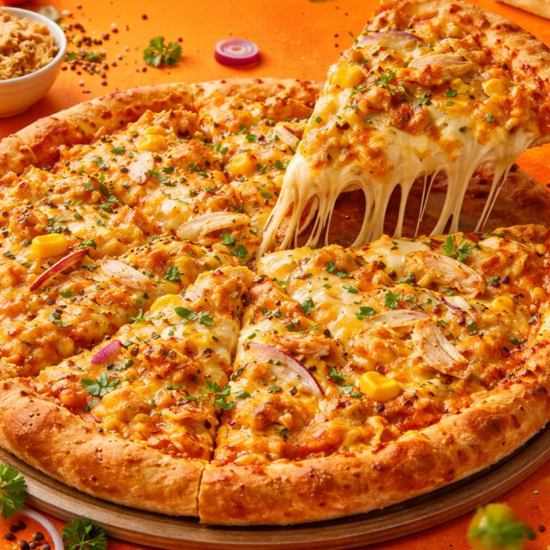 Molho de tomate, queijo mussarela, frango, cheddar e orégano.