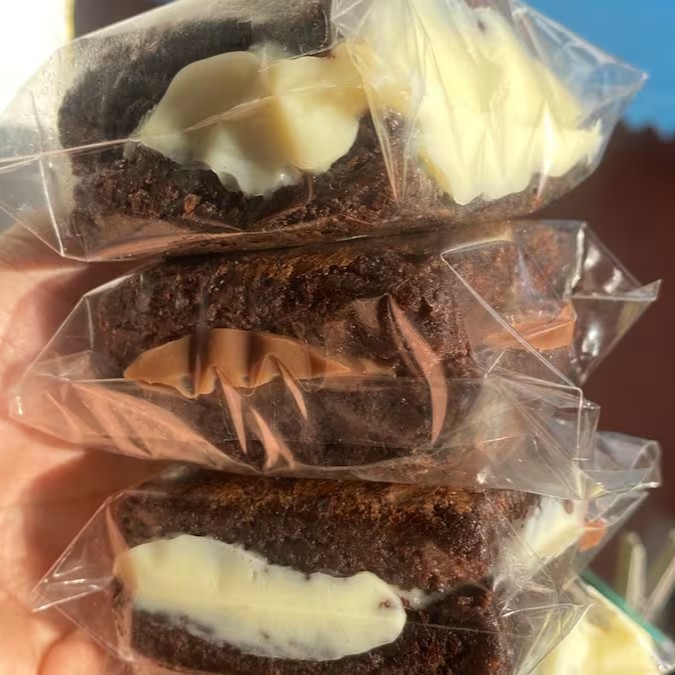 Brownie com Recheio de Brigadeiro feito com cacau 50% e Ninho, uma combinação inusitada que vai te conquistar. Uma explosão de sabores!