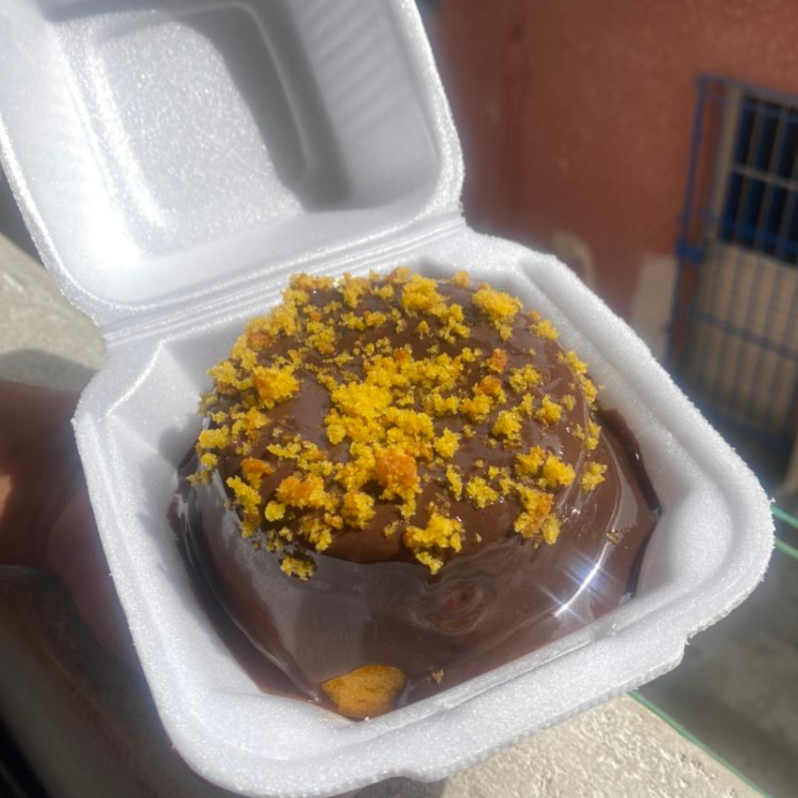 Bolo de chocolate com uma cobertura de chocolate feita com Cacau 50%, o Mais Pedido, Com Pedaços de Brownie no Topo, Uma explosão de sabor em cada fatia!