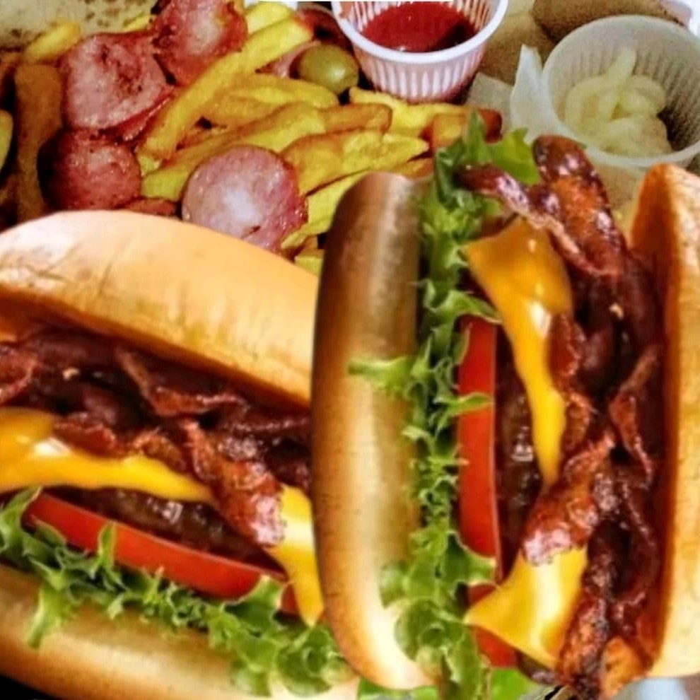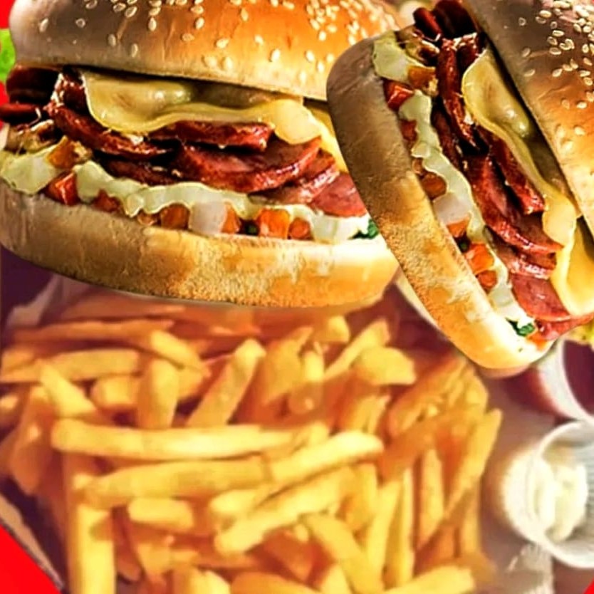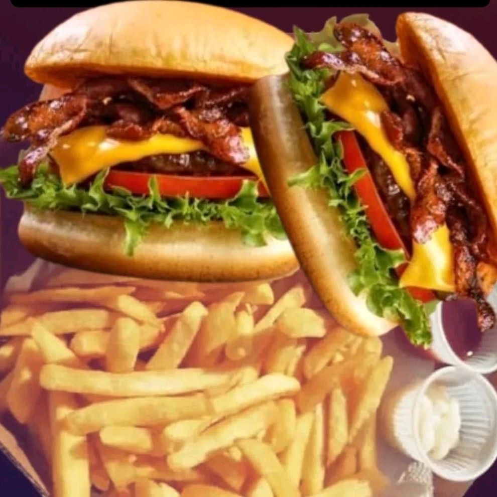 2 Pão bola recheado com hambúrguer queijo, presunto, bacon, tomate,cebola,alface , cheddar, Catupiry ketchup e maionese acompanhado com 300ml de batata frita e calabresa