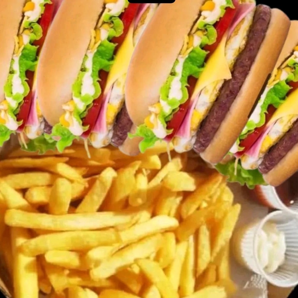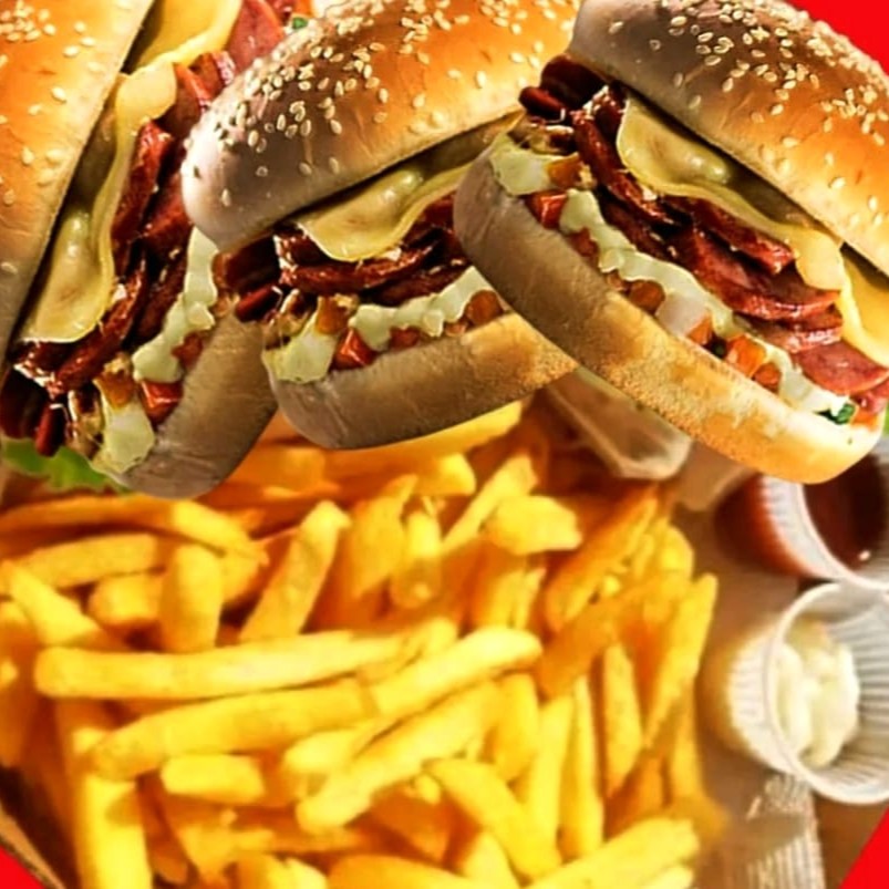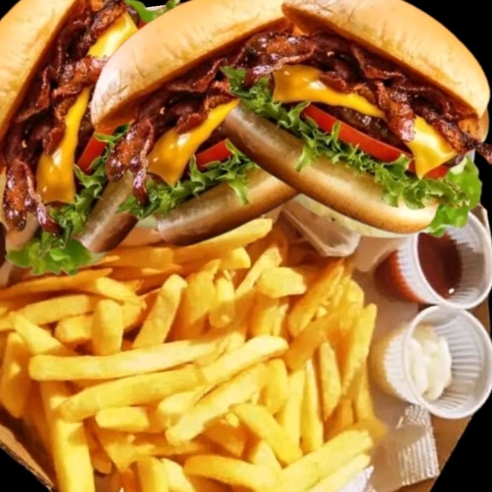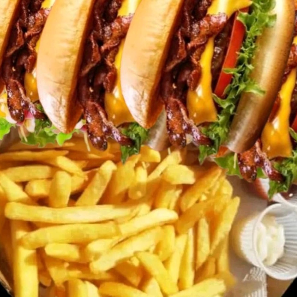 2 Pão bola recheado com hambúrguer queijo, presunto, bacon, tomate,cebola,alface , cheddar, Catupiry ketchup e maionese acompanhado com 300ml de batata frita e calabresa