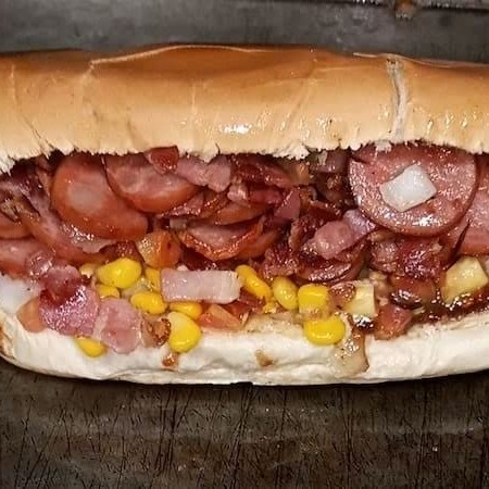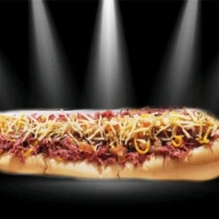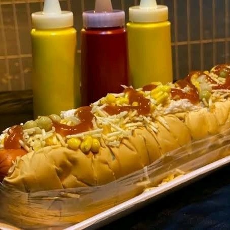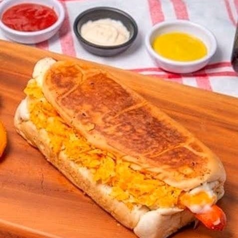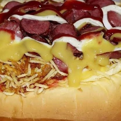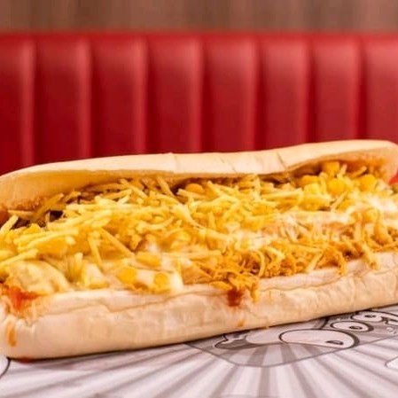 Pão Seda recheado com carne moída, salsicha, calabresa na chapa , cheddar, Catupiry, queijo ralado, ketchup, maionese, batata palha, tomate, cebola, milho verde