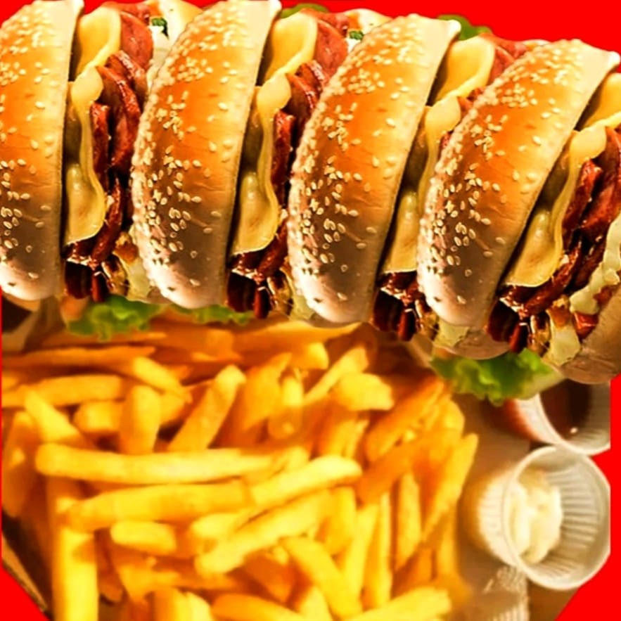 4 Pão bola recheado com hambúrguer queijo, presunto, bacon, tomate,cebola,alface , cheddar, Catupiry ketchup e maionese acompanhado com 300ml de batata frita e calabresa