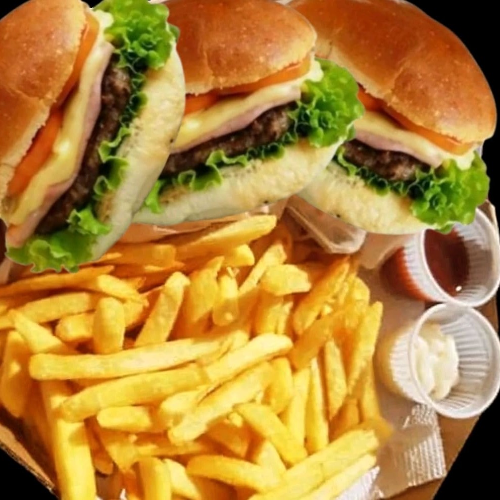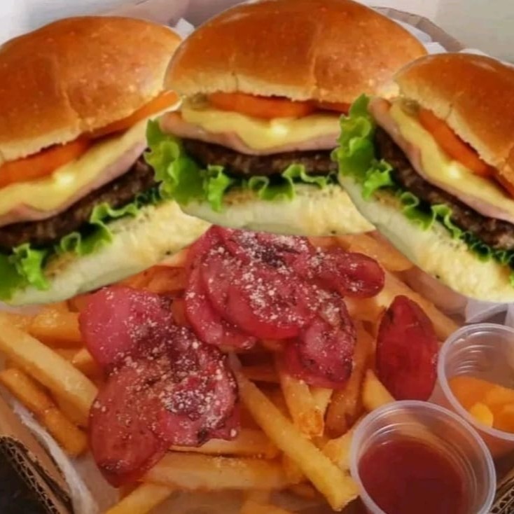 3 pão bola recheado com hambúrguer queijo mussarela e presunto acompanhado com tomate cebola alface cheddar Catupiry ketchup maionese+ 300ml de batata frita e calabresa