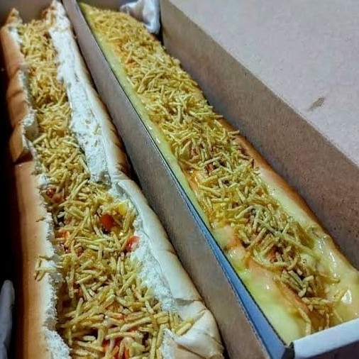 Pão Seda de 30cm recheado com carne moída salsicha calabresa assada na chapa tomate cebola milho verde cheddar Catupiry batata palha queijo ralado ketchup e maionese