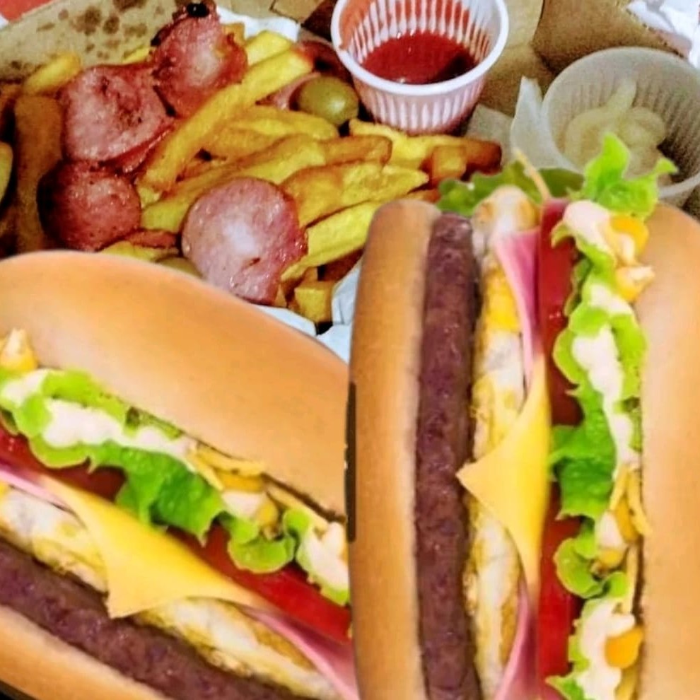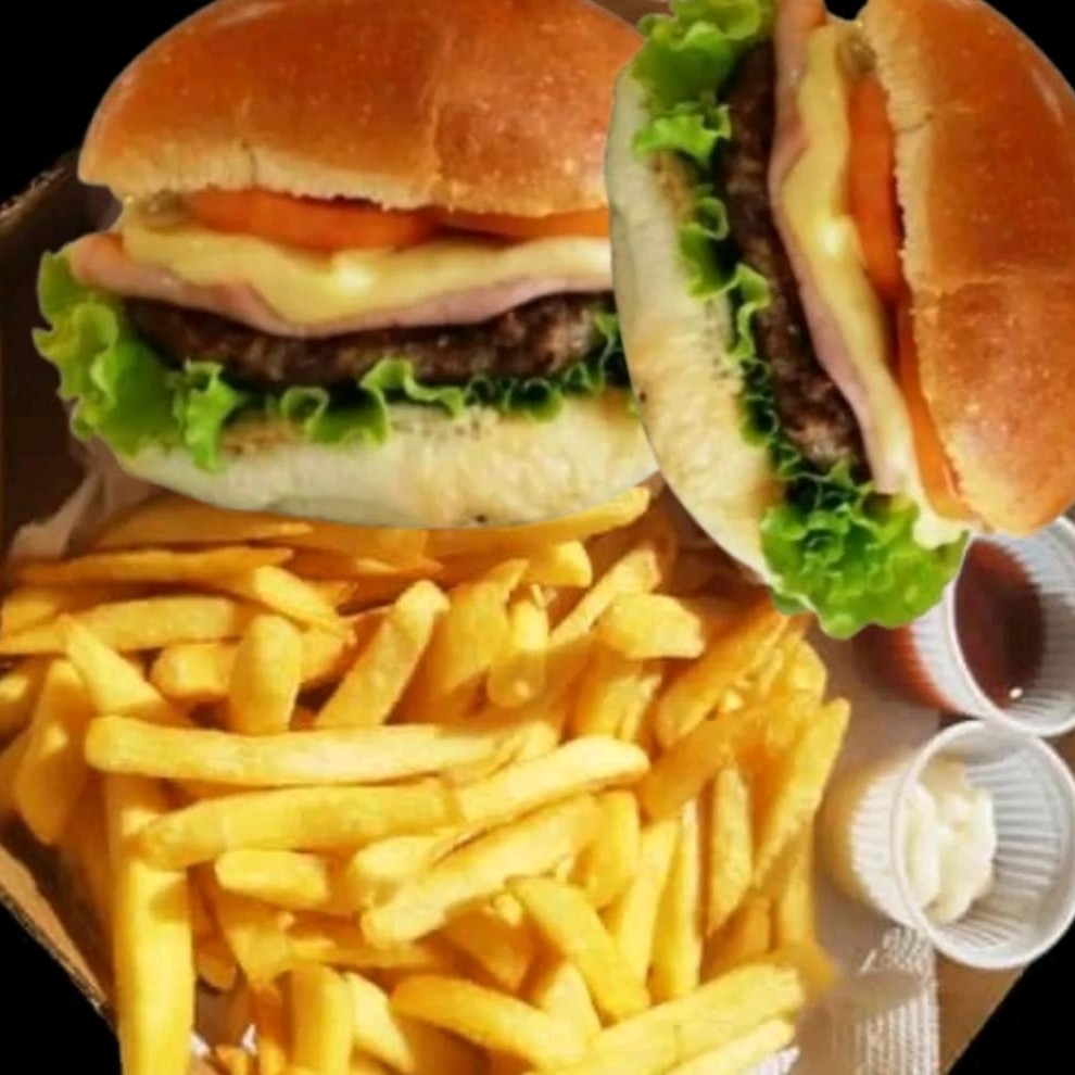 2 pão bola recheado com hambúrguer queijo mussarela presunto acompanhado com tomate cebola alface cheddar Catupiry ketchup maionese+ 300ml de batata frita e calabresa