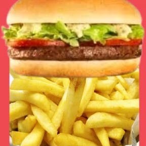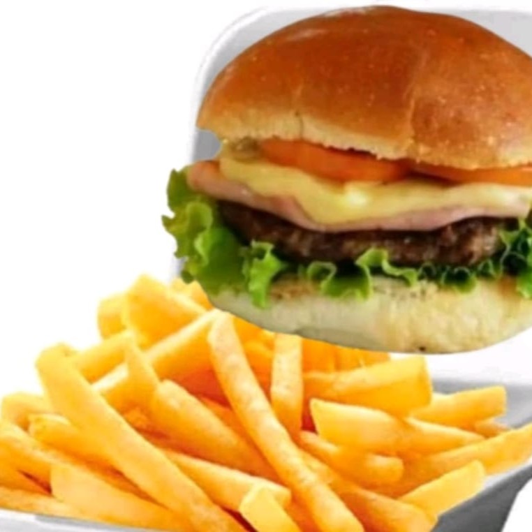 1 pão bola recheado com hambúrguer queijo mussarela presunto ovo acompanhado com tomate cebola alface cheddar Catupiry ketchup maionese+ 300ml de batata frita e calabresa
