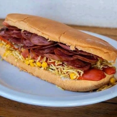 Pão Seda recheado com carne moída, salsicha, charque desfiada,tomate, cebola, milho verde, chedda, Catupiry, queijo ralado, ketchup, maionese, batata palha