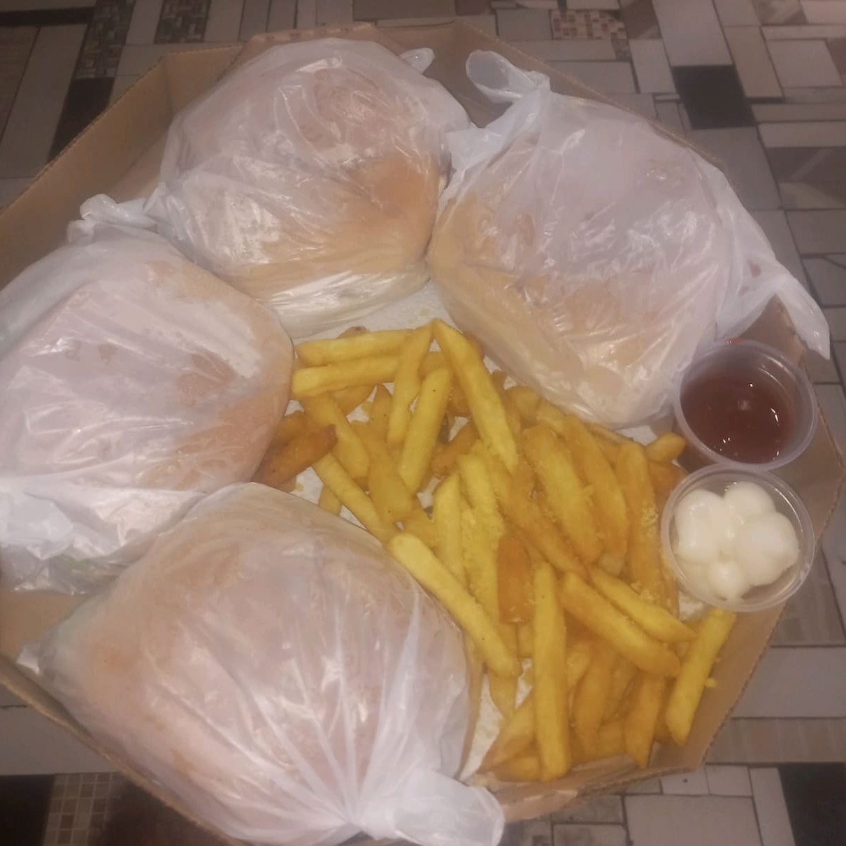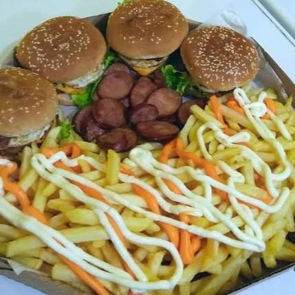 4 pão bola recheado com hambúrguer chedda Catupiry tomate cebola alface ketchup maionese acompanhado com 300ml de batata frita e calabresa