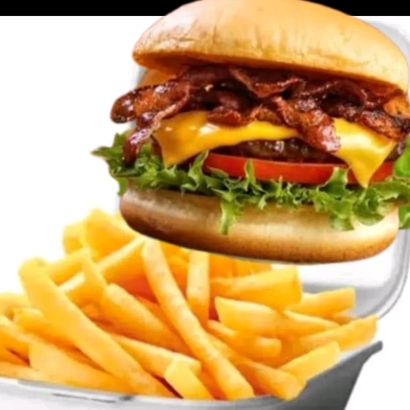1 Pão bola recheado com hambúrguer queijo, presunto, bacon, tomate,cebola,alface , cheddar, Catupiry ketchup e maionese acompanhado com 300ml de batata frita e calabresa