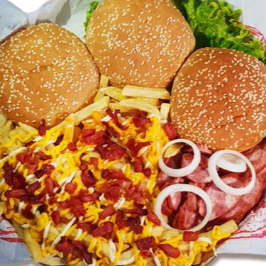 3 Pão bola recheado com hambúrguer queijo, presunto, bacon, tomate,cebola,alface , cheddar, Catupiry ketchup e maionese acompanhado com 300ml de batata frita e calabresa