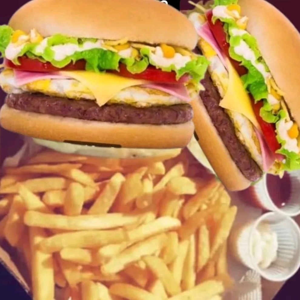 2 pão bola recheado com hambúrguer queijo mussarela presunto ovo acompanhado com tomate cebola alface cheddar Catupiry ketchup maionese+300ml de batata frita e calabresa