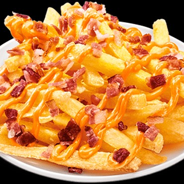 Porção de fritas média 250g. Acompanhada com cheddar e bacon