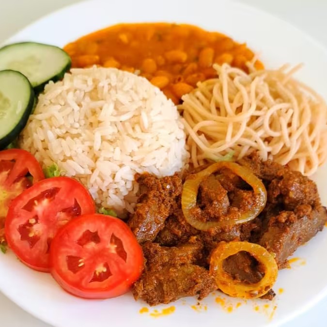 Com arroz e macarrão refogado com alho, feijão com tempero caseiro e salada de tomate, alface e pepino e farofa caseira.