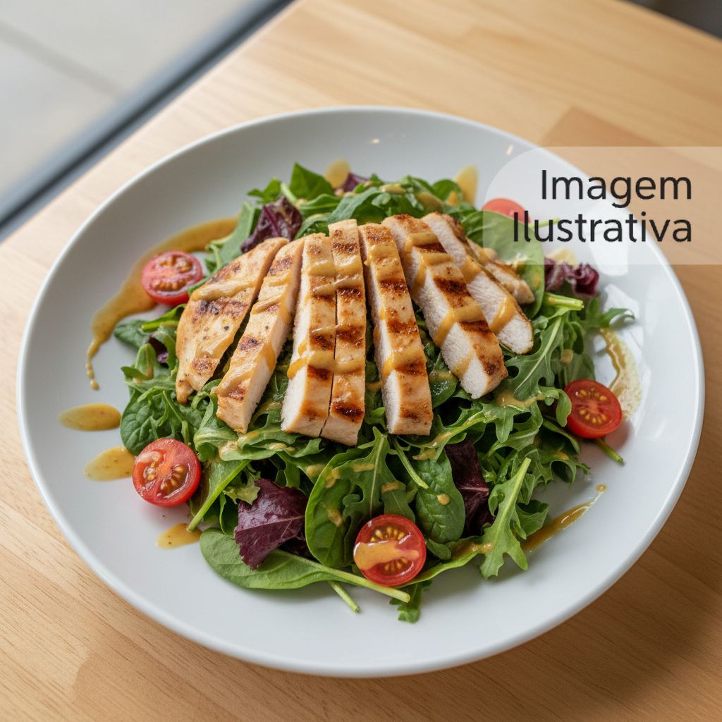 Peito de frango grelhado, mix de folhas verdes, tomate cereja e molho de mostarda e mel.