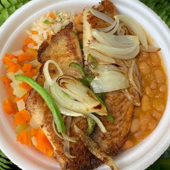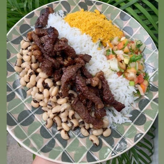 Acompanhamentos: arroz carioca, feijão macassar, farofa e vinagrete.