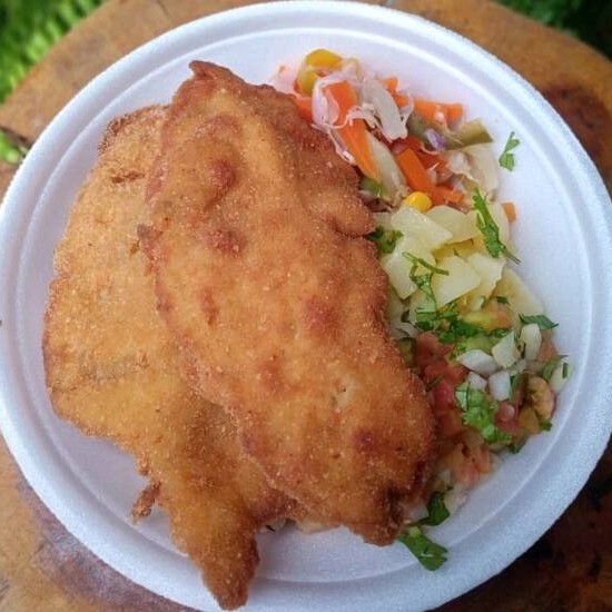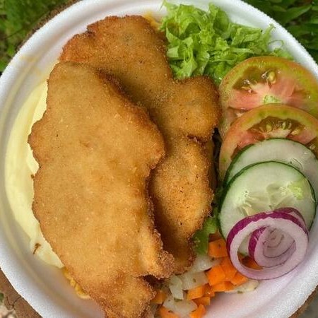 Peito de frango empanado; acompanhamentos: arroz carioca, macarrão, feijão, pure de batata, verduras e farofa.