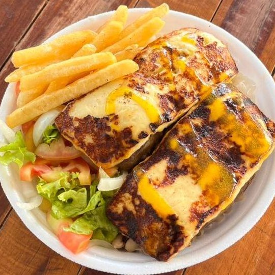 Almoço individual. Acompanhamentos. Carne de Sol, 2 Fatias de queijo coalho em cima da Carne, Feijão, Arroz, Macarrão, e a nossa deliciosa Salada.