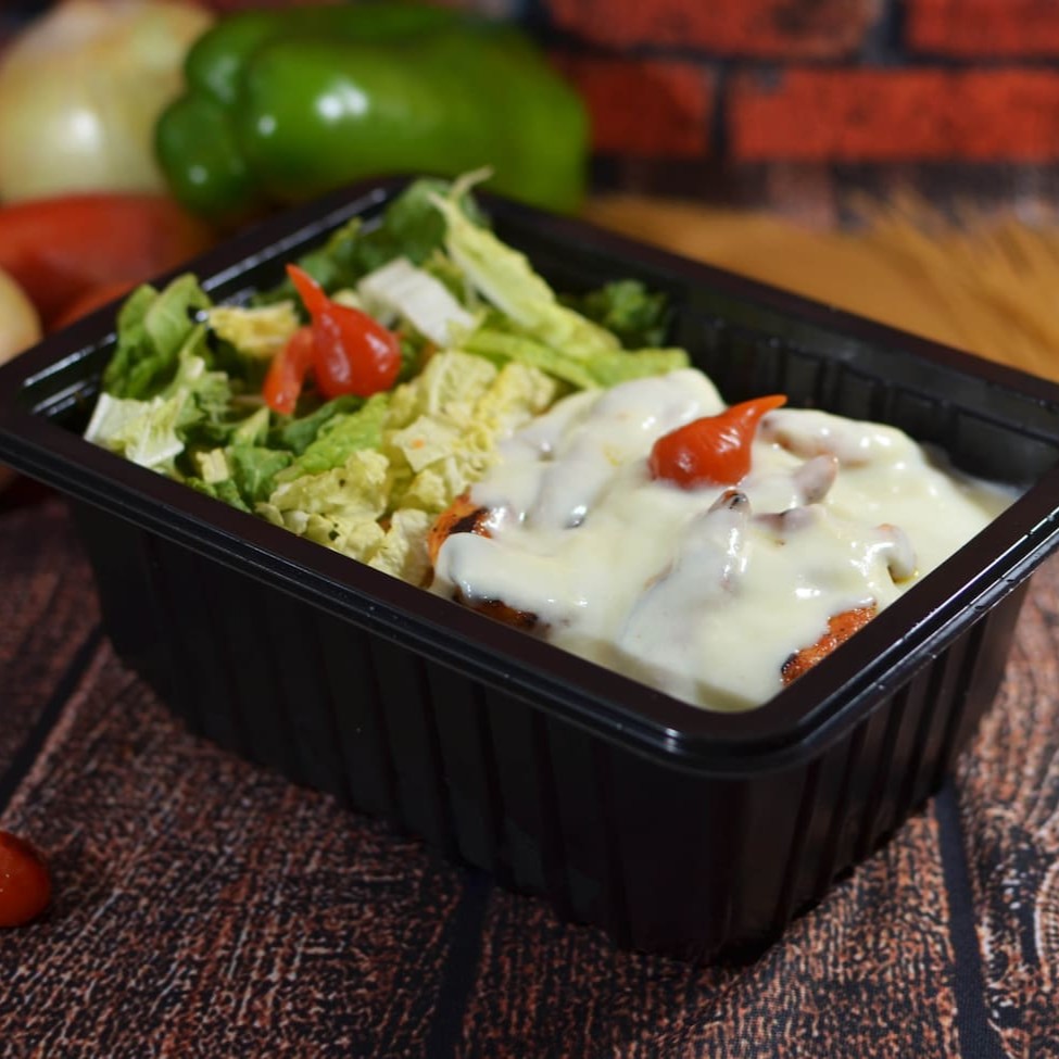 Iscas de peito de frango refogadas e suculentas, cobertas com um molho quatro queijos super cremoso, preparado com provolone, gorgonzola, muçarela e parmesão, formando uma combinação intensa, aromática e irresistível para quem ama sabores marcantes. Proteína: 🍗 Frango ao molho quatro queijos: 100 g de peito de frango refogado, finalizado com molho cremoso especial de quatro queijos. Escolha até 5 acompanhamentos: 🥘 Feijão com caldo — 200 g 🍚 Arroz branco — 120 g 🍝 Macarrão — 120 g 🌽 Farofa — 20 g 🥗 Salada — 25 g Embalagem: acondicionada em marmita de 750 ml, lacrada e selada, garantindo higiene, conservação e qualidade até você.