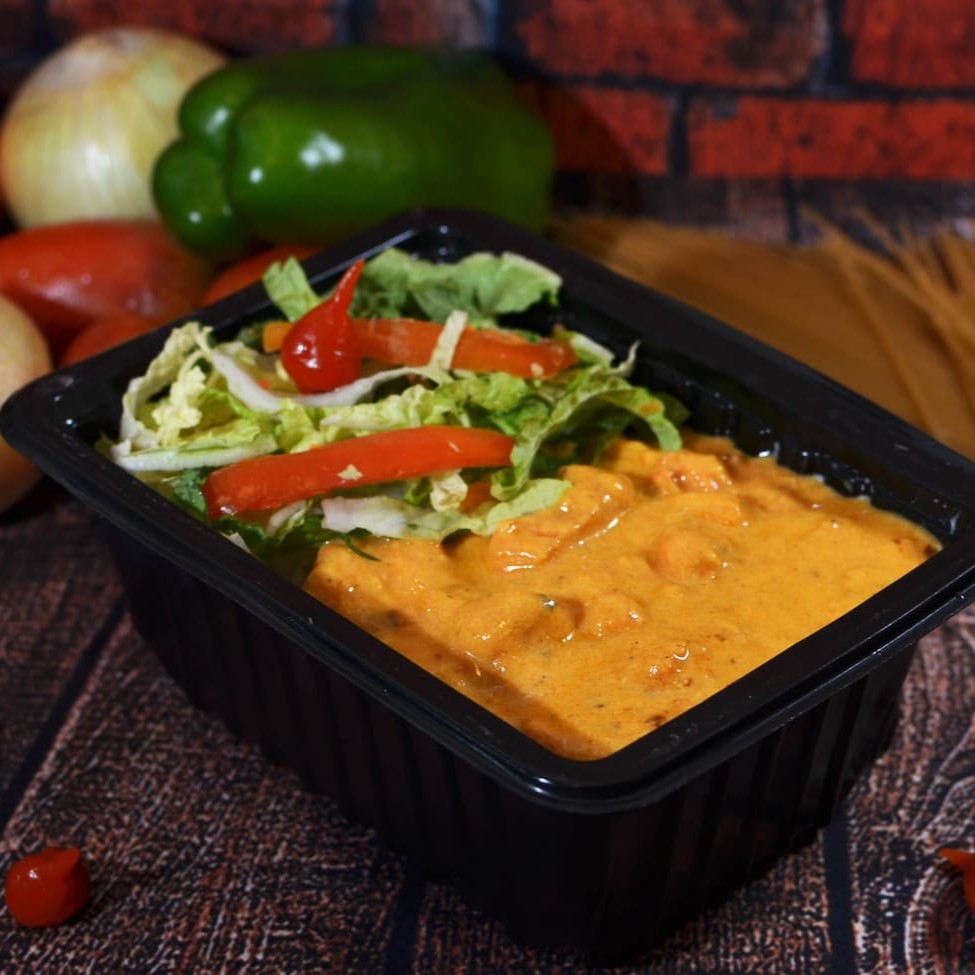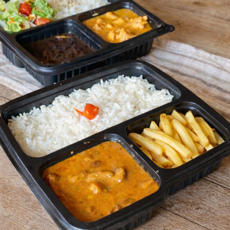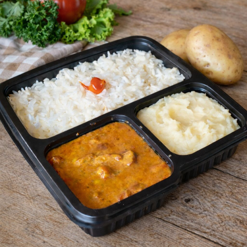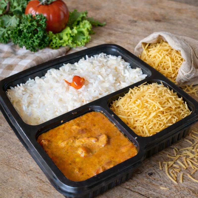 Cubos de frango macios e suculentos, envolvidos em um exclusivo molho cremoso de tomate com creme de leite e um toque de tempero especial que realça cada sabor. Acompanha arroz branco soltinho e purê de batata aveludado, formando uma combinação clássica, equilibrada e extremamente reconfortante. Porção composta por: * 300 g de arroz branco soltinho * 250 g de estrogonofe de frango * 140 g de purê de batata Embalagem: acondicionada em embalagem de 1000 ml com três divisórias, embalada e selada para garantir higiene, conservação e qualidade até chegar a você. 🍽️