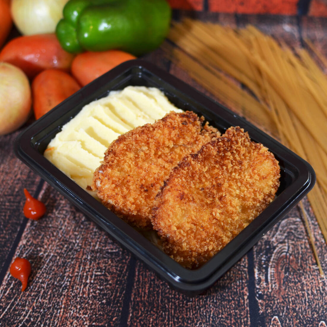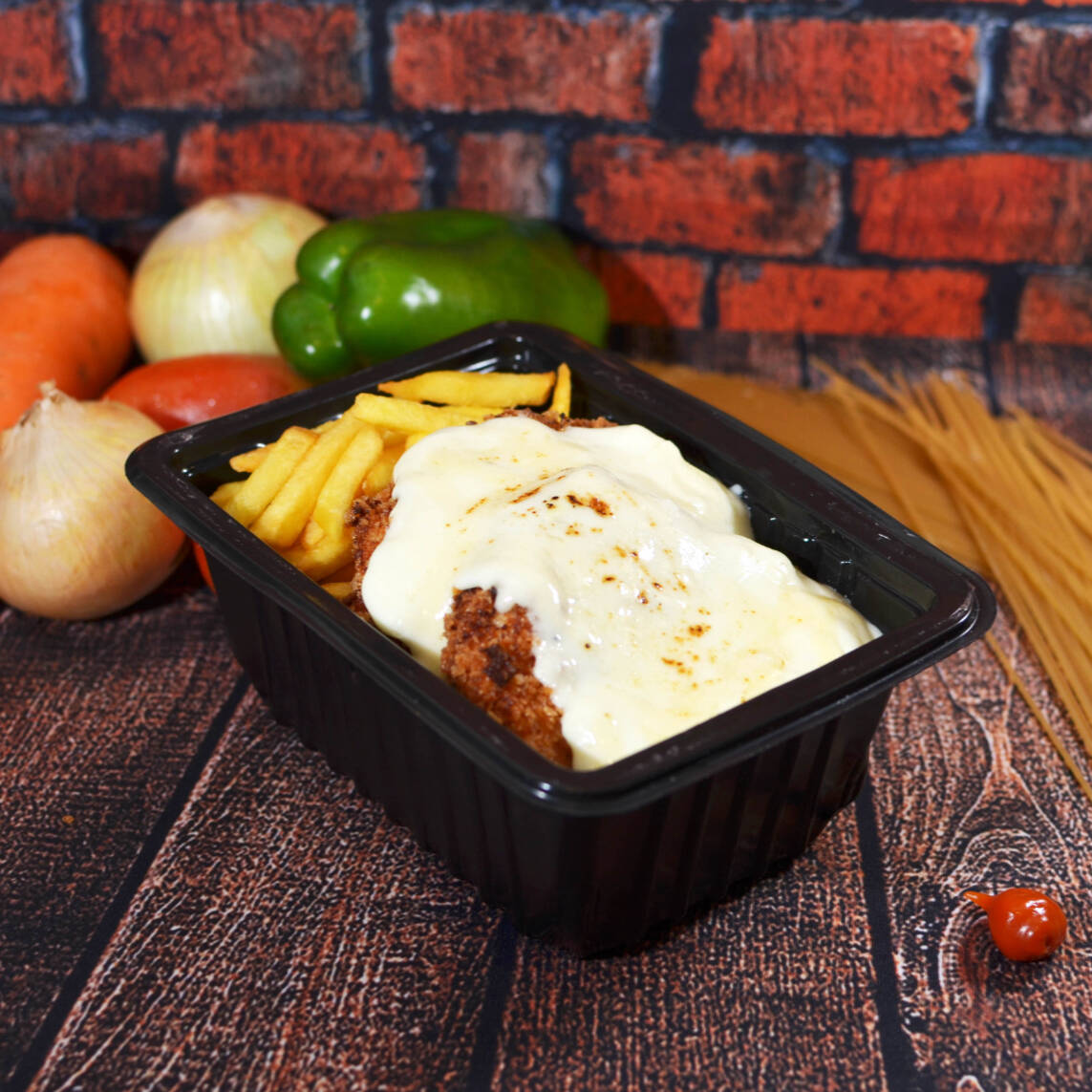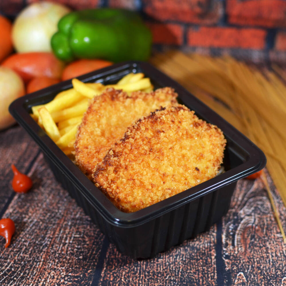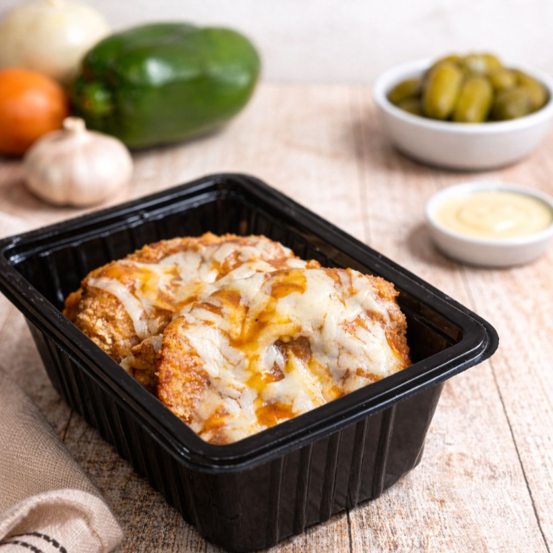 Filé de frango empanado (100g), frito até ficar crocante por fora e macio por dentro, coberto com 100g de molho de tomate da casa e finalizado com 1 fatia de mussarela (30g). Acompanha 100g de purê. Você pode escolher até 4 acompanhamentos entre: Feijão com caldo – 200g Arroz branco – 120g Macarrão espaguete – 120g Farofa temperada – 20g Refeição individual, servida em embalagem retangular de 750ml, lacrada em máquina para garantir segurança e qualidade. Ideal para quem quer uma refeição completa, equilibrada e com sabor de comida caseira bem preparada.
