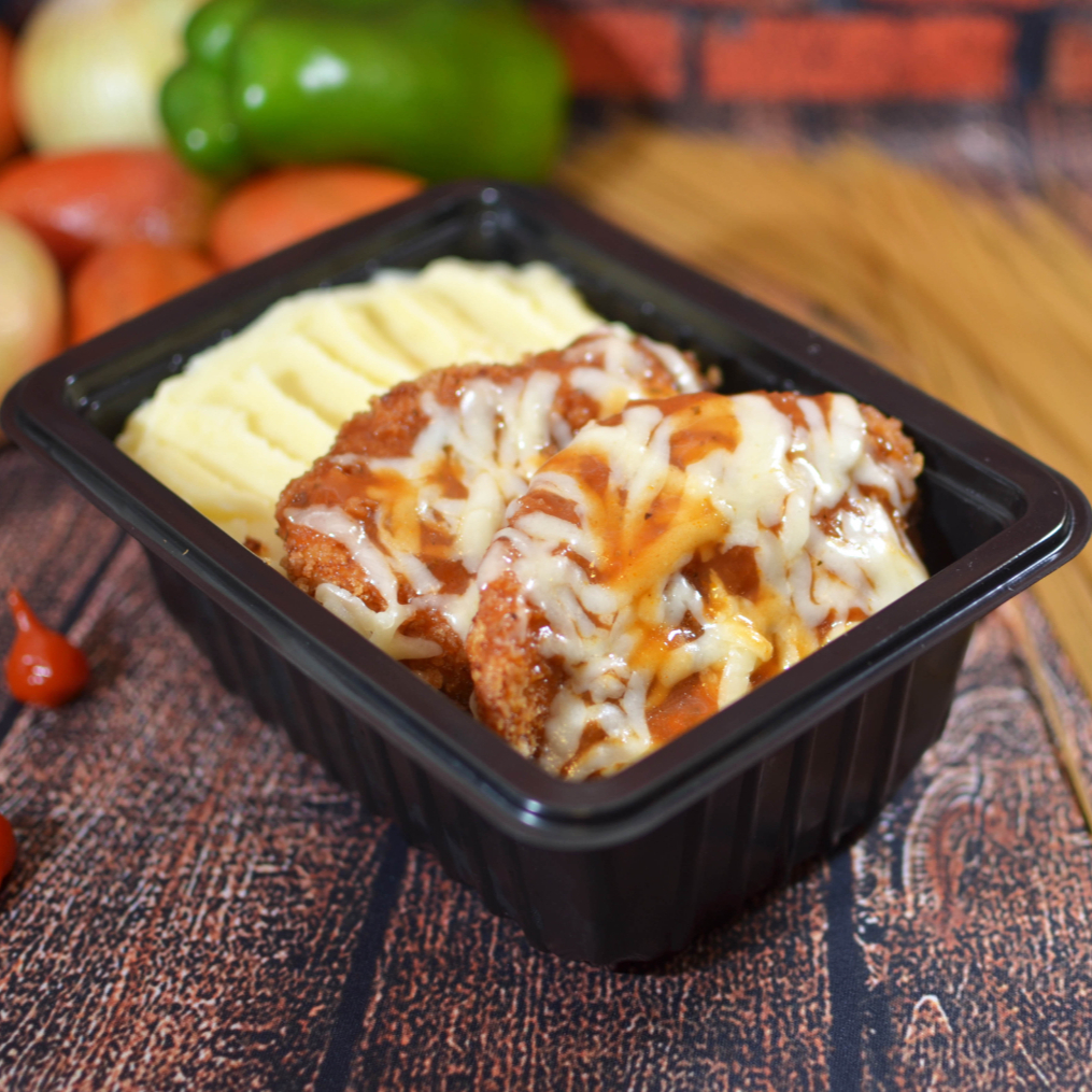 Dois filés de frango empanados e fritos na hora (aprox. 100g), crocantes por fora e macios por dentro, cobertos com 300g do nosso molho de tomate artesanal bem encorpado e finalizados com uma generosa fatia de muçarela (30g) derretendo por cima. Acompanha aproximadamente 220g de macarrão espaguete envolvido no molho da casa e 100g de purê para completar a refeição. Servido em embalagem de 750ml, lacrada para garantir qualidade e segurança. Ideal para uma pessoa que gosta de uma refeição bem servida, saborosa e completa.