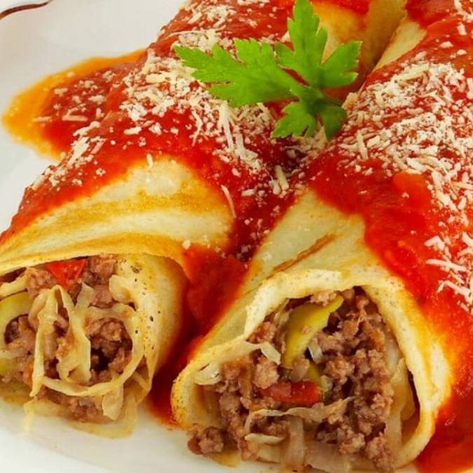 Panquecas de carne, macias, recheadas com uma carne com muito sabor, cobertas com molho encorpado e finalizadas com queijo ralado. Um prato que conforta e conquista na primeira garfada. Acopanhada por macarrão ou arros. Batata frita