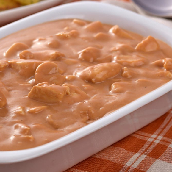 Strogonoff de Frango Cubos suculentos de frango dourados no ponto certo, envolvidos em um molho cremoso e aveludado à base de creme de leite, com o equilíbrio perfeito entre sabor e conforto. Acompanhado de arroz branquinho soltinho e batata frita crocante para fechar com chave de ouro.