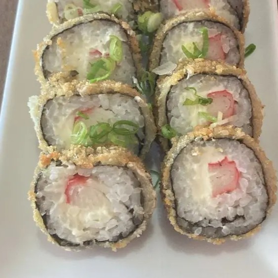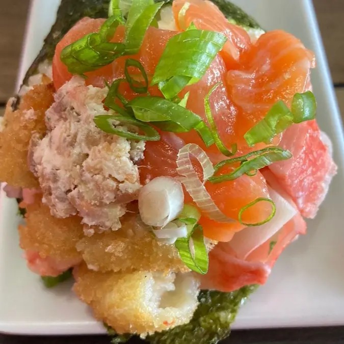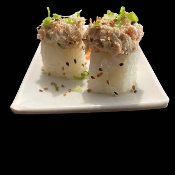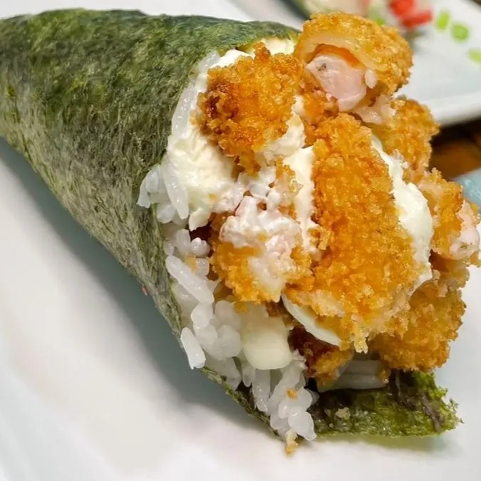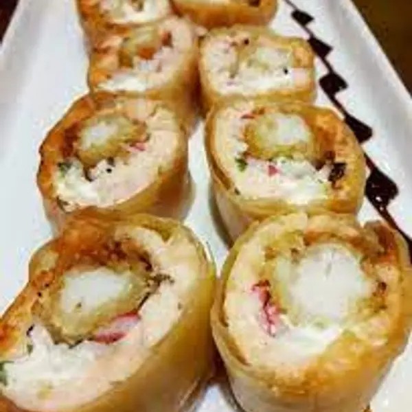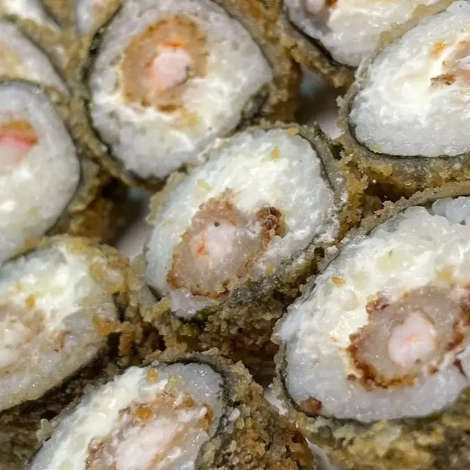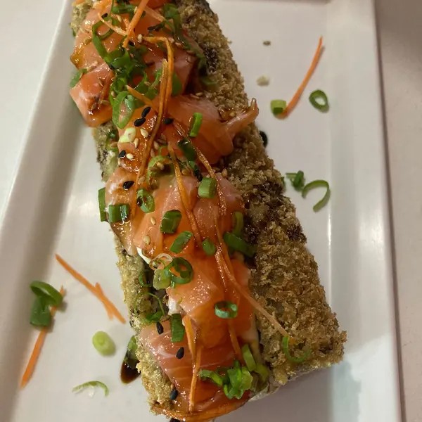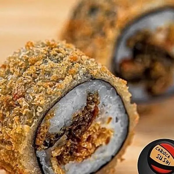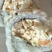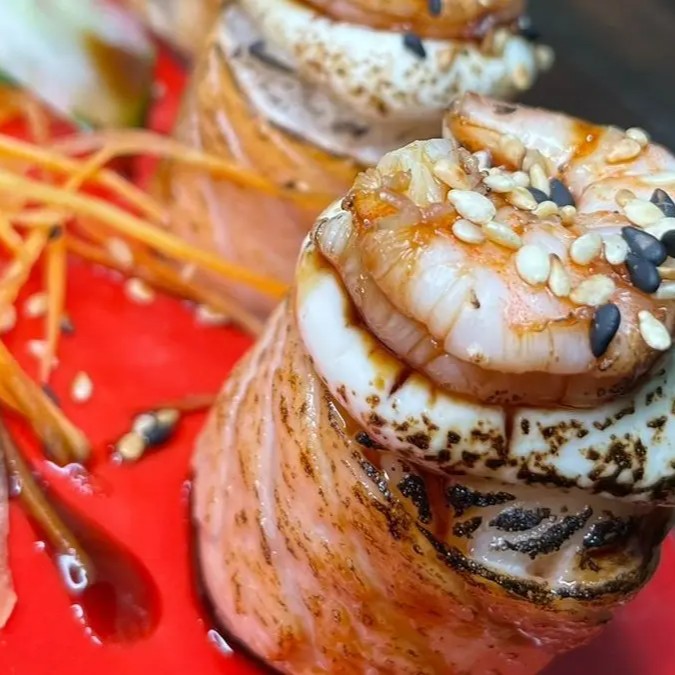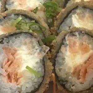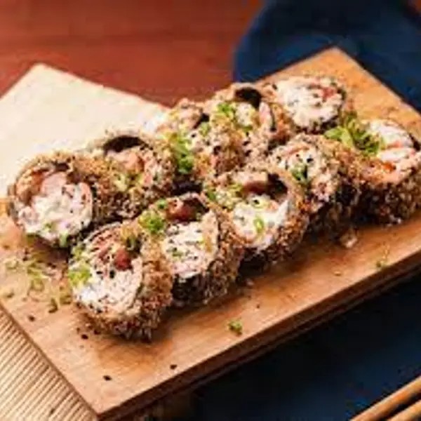 Manta de salmão maçaricado, recheada, arroz, camarão empanado e cream cheese.