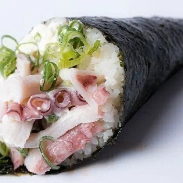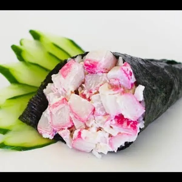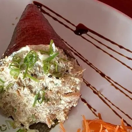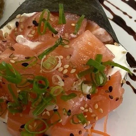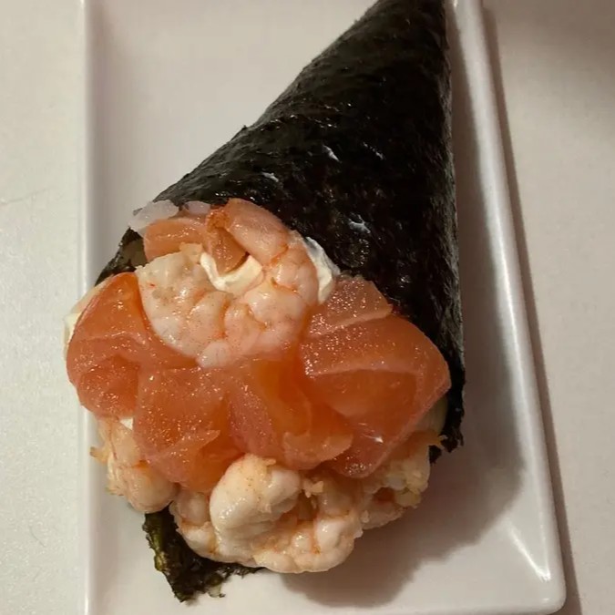 Temaki misto (Alga + Arroz + Cream Cheese + Camarão + Kani + Salmão ou pasta de salmão)escolha do chefe.